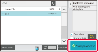 È possibile selezionare molteplici file. Il file che è stato toccato sarà contrassegnato da un segno di spunta. Per selezionare tutti i file di una cartella, toccare il tasto [Selezionare tutto]. Per eliminare i file selezionati, toccare il tasto [Elimina]. Selezionare uno dei file e toccare "Conferma immagine" nel pannello operativo per controllare l'immagine in anteprima dei dati stampa. Il funzionamento della schermata di anteprima è lo stesso del metodo utilizzato per controllare le immagini nell'archiviazione documenti. Vedere " COMPROBACIÓN DE IMÁGENES DE ARCHIVOS". È anche possibile toccare "Vedi informazioni dettagliate" sul pannello operativo per controllare informazioni dettagliate come il formato di stampa del file. Quando si desidera stampare un file, procedere con il passo successivo.Confermare le impostazioni di stampa e toccare il tasto [Stampa adesso].