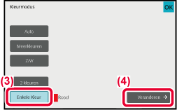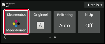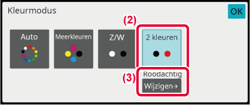 Nadat de instellingen voltooid zijn, tikt u op de toets [OK] op het scherm [2 kleuren], en controleert u of de gewijzigde instelling wordt weergegeven naast de toets [2 kleuren] in het scherm kleurenmodus.Het origineel wordt gekopieerd in elke willekeurige