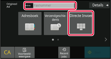 Tik op de toets [Directe Invoer] of de toets [Faxnummer] om het faxnummer van de bestemming in te voeren.