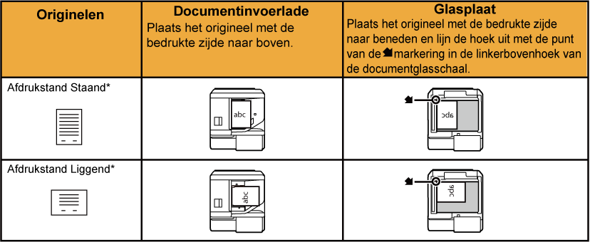 Plaats het origineel in de documentinvoerlade van de automatische documentinvoereenheid of op de glasplaat.Waarschuwing