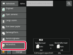 Als de instelling voor de kleurmodus [Meerkleuren] is in de scanmodus, wordt de afbeelding verzonden in Mono2 naar faxadressen en in kleur naar scanadressen. Om de afbeelding in Mono2 naar alle adressen te verzenden, tikt u in de normale modus op [Zelfde beeld verz. als faxadres] op het actiepaneel |