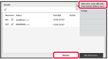 Nadat u op de tab [Mislukt] hebt getikt, tikt u op de toets [Opn.verz. naar alle adr. met fouten tijdens verz.] in het actiepaneel om de afbeelding opnieuw te verzenden.