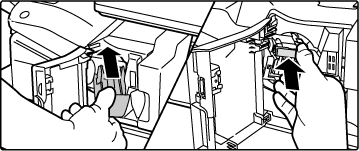 Skyv stiftebeholderen inn til den klikker seg på plass.Lukk frontdekselet på etterbehandleren.