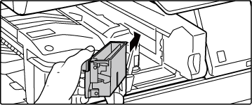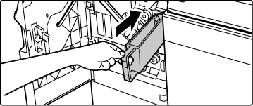 Hvis hullingsavfallsboksen ikke settes på plass igjen på riktig måte, kan ikke utskrift utføres med hullingsfunksjonen.Skyv etterbehandleren til høyre til den stopper.