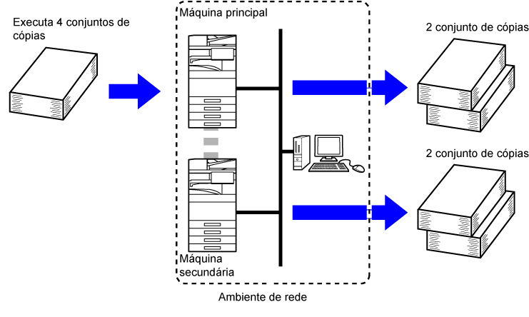 Opptil 9999 kopier (sett) kan velges. Det spesifiserte antallet kopier deles mellom primærenheten og sekundærenheten. Hvis antallet kopier utgjør et oddetall, lager primærenheten flere kopier enn sekundærenheten.Trykk på [Farge Start]- eller [S/H Start]-tasten for å begynne å kopiere.