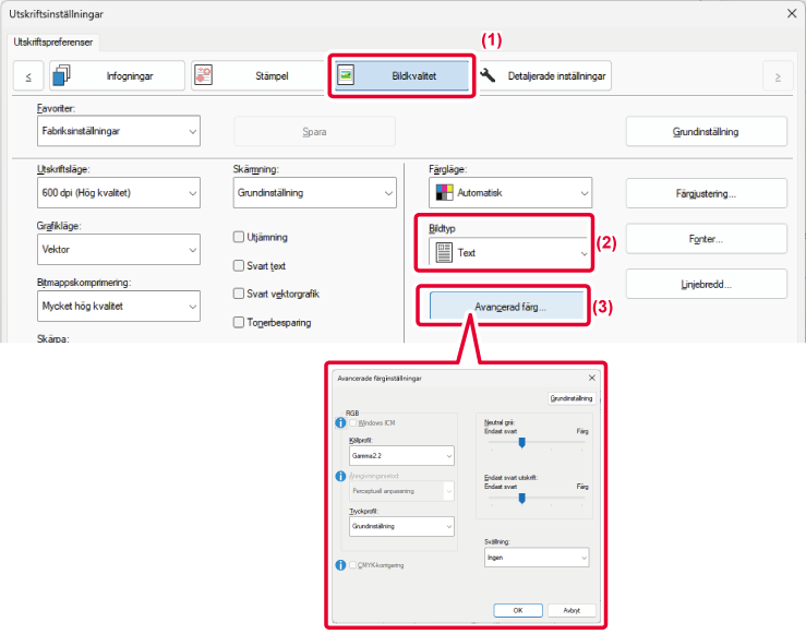 Avanserte fargeinnstillinger, som innstillinger for fargebehandling