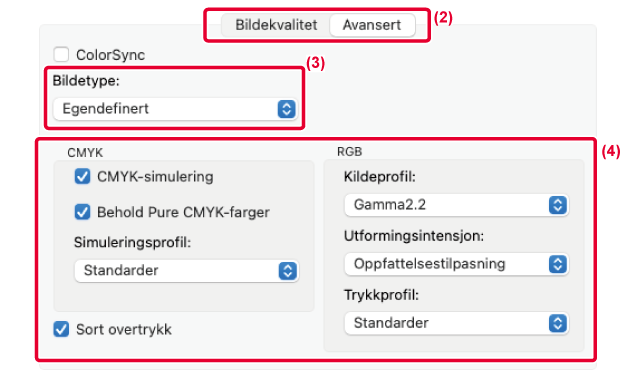 [Egendefinert] i "Bildetype", deretter [CMYK-simulering]-avkrysningsboksen