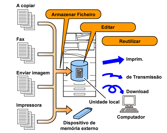 Når kopiering, bildesending eller en annen jobb utføres, lagrer denne funksjonen dokumentdata til den lokale stasjonen. I motsetning til med hurtigfil, kan ulike typer informasjon tilføyes til filen når filen lagres for å gjøre det mulig med effektiv filhåndtering. Et passord kan også opprettes. |