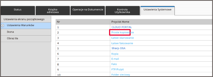 Część ustawień może wymagać podania hasła po kliknięciu [Ustawienia ekranu początkowego]. Jeśli nie wykonano autoryzacji użytkownika, należy wpisać hasło administratora.Naciśnij [Ustawienia Warunków], a następnie wybierz odpowiednią pozycję na liście "Przycisk Ustal".