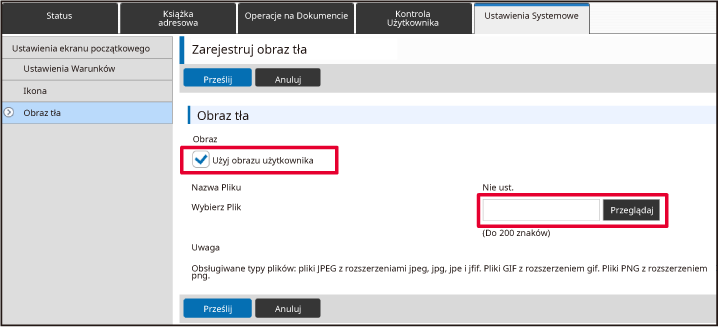 Naciśnij przycisk [Przeglądaj] i wybierz plik, który ma zostać przesłany.Po zakończeniu konfigurowania ustawień naciśnij przycisk [Prześlij].