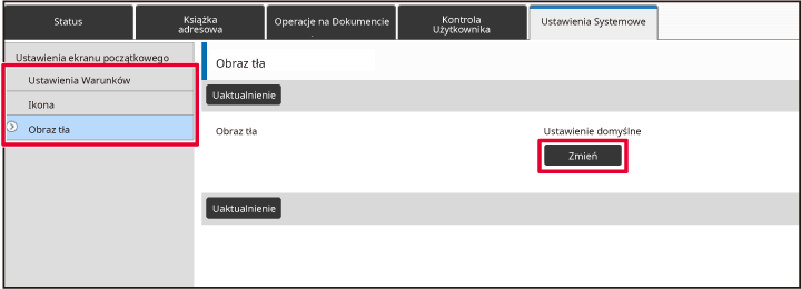 Część ustawień może wymagać podania hasła po kliknięciu [Ustawienia ekranu początkowego]. Jeśli nie wykonano autoryzacji użytkownika, należy wpisać hasło administratora.Kliknij przycisk [Zmień] w części [Obraz tła].
