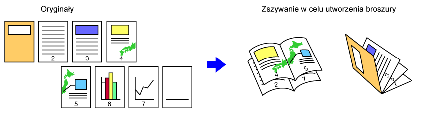 Ułóż oryginał na tacy automatycznego podajnika dokumentów lub na szybie dokumentów.Naciśnij przycisk [Inne], a następnie przycisk [Broszura], lub naciśnij przycisk [Sort. ze zszyw.], a następnie przycisk [Zszywanie Siodłowe].