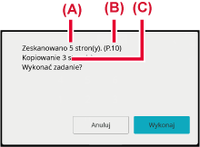 Na ekranie potwierdzenia w polu (A) zostanie wyświetlona liczba zeskanowanych arkuszy oryginału, w polu (B) – liczba zeskanowanych stron, a w polu (C) – liczba kopii z pominięciem pustych stron.Tło można wyrównać poprzez ustawienie jasnych