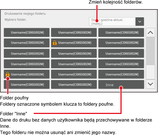 Użytkownicy mogą drukować dane z własnych folderów na urządzeniu.