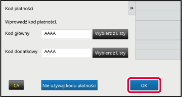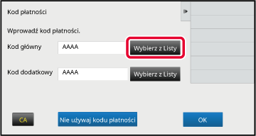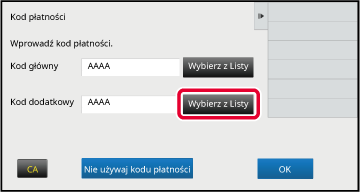 Gdy wyświetlone jest okno wprowadzania kodu płatności, naciśnij przycisk [Wybierz z Listy] obok pola kodu głównego.