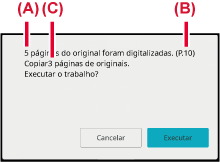 No ecrã de confirmação, o número de folhas originais digitalizadas aparece em (A), o número de lados digitalizados em (B) e o número de cópias, excluindo páginas em branco, em (C).Pode ajustar o fundo tornando as áreas claras
