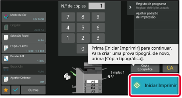 Efetue apenas um conjunto de cópias.Verifique o resultado da cópia. Se não houver problemas, bata levemente na tecla [Iniciar Imprimir].