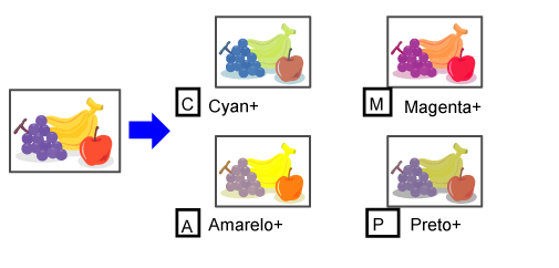cores amarelo, magenta, ciano e preto são divididas em três intervalos,