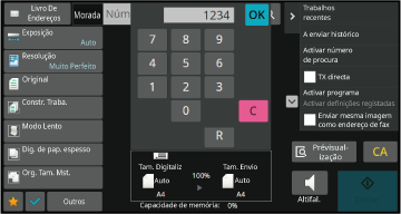 Toque na tecla [Entr. Directa] ou [Número de Fax] para introduzir o número de fax de destino.