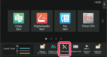 As "Definições" permitem gerir várias funções que facilitam o uso da máquina como, por exemplo, a predefinição de cada função, definições de ligação à rede e verificação do registo do estado de operação.