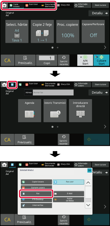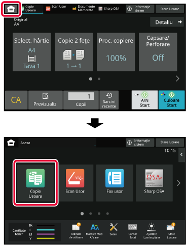 pe panoul tactil. Ecranul principal afişează tastele pentru selectarea