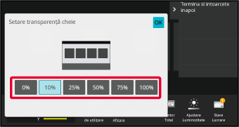 Anumite setări pot cere să introduceţi parola de utilizator după ce aţi executat clic pe [Setări ecran principal]. Dacă nu aţi efectuat autentificarea ca utilizator, trebuie să introduceţi parola de administrator.Executaţi clic pe [Setări condiţie] şi apoi clic pe butonul [Setare transparență cheie].