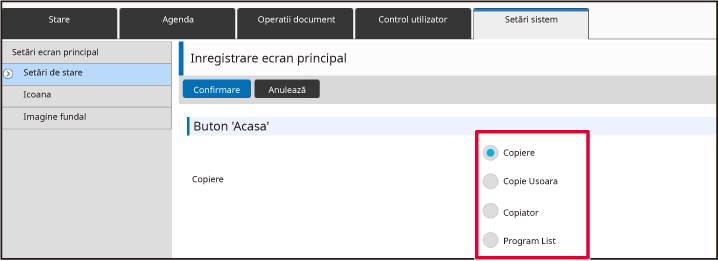 Când executaţi clic pe butonul [Confirmare], ecranul [Inregistrare ecran principal] se închide.Când aţi finalizat configurarea setărilor, executaţi clic pe butonul [Confirmare].