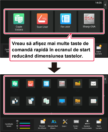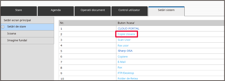 Ecranul se schimbă în ecranul de setări.Atingeți [Setări sistem] → [Setări ecran principal] și apoi atingeți tasta [Poziția butonului de pornire].