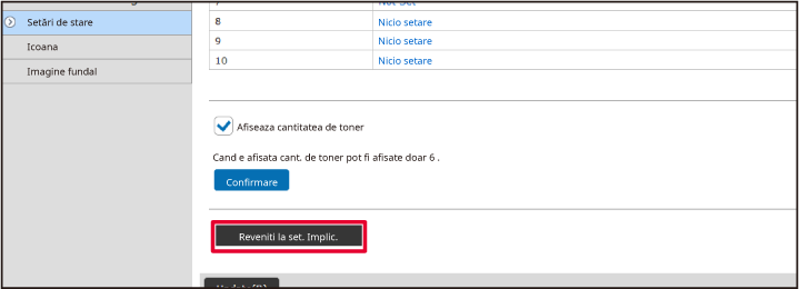 Anumite setări pot cere să introduceţi parola de utilizator după ce aţi executat clic pe [Setări ecran principal]. Dacă nu aţi efectuat autentificarea ca utilizator, trebuie să introduceţi parola de administrator.Executaţi clic pe [Setări condiţie] şi apoi clic pe butonul [Revenire la set. implicite].