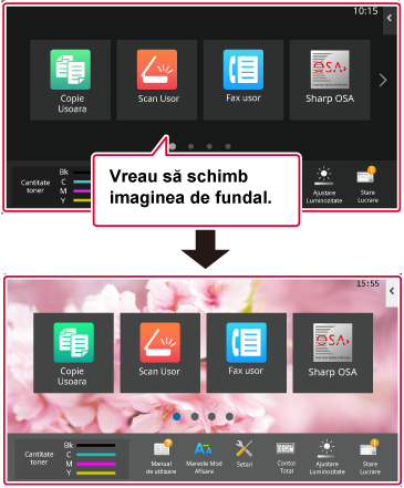 Ecranul se schimbă în ecranul de setări.Atingeți [Setări sistem] → [Setări ecran principal] → [Imagine fundal], apoi atingeți tasta [Modifica].