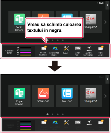 Anumite setări pot cere să introduceţi parola de utilizator după ce aţi executat clic pe [Setări ecran principal]. Dacă nu aţi efectuat autentificarea ca utilizator, trebuie să introduceţi parola de administrator.Faceți clic pe [Icoana].