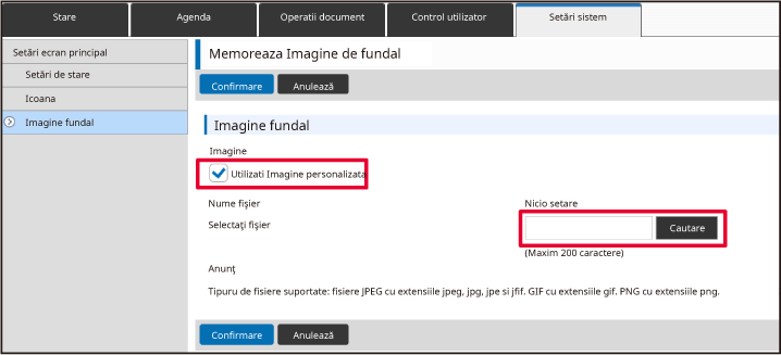 Anumite setări pot cere să introduceţi parola de utilizator după ce aţi executat clic pe [Setări ecran principal]. Dacă nu aţi efectuat autentificarea ca utilizator, trebuie să introduceţi parola de administrator.Executaţi clic pe butonul [Modifica] din [Imagine fundal].