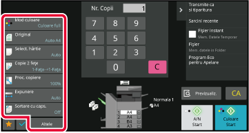 MODURILE DE COPIERE COLORSELECTAREA ORIENTĂRII ŞI DIMENSIUNII ORIGINALULUISELECTAREA TĂVII DE HÂRTIE PENTRU COPIERECOPIEREA AUTOMATĂ FAŢĂ-VERSOMĂRIREA/MICŞORAREA SEPARATĂ A LUNGIMII