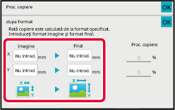Atingeţi aria formatului imaginii şi a formatului de ieşire şi introduceţi formatele cu ajutorul tastelor numerice.Această secţiune explică modul de specificare