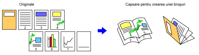 Puneţi originalul în tava de alimentare cu documente a alimentatorului automat de documente sau pe geamul pentru documente.Atingeți tasta [Sortare cu caps.] şi tasta [Capsare tip broşură].