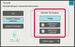 Puneţi originalul în tava de alimentare cu documente a alimentatorului automat de documente sau pe geamul pentru documente.Atingeţi scurt tasta [Altele] şi apoi tasta [Tip Carte] sau atingeţi scurt tasta [Sortare cu caps.] şi apoi tasta [Capsare tip broşură].