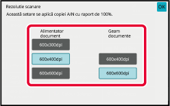 Rezoluţia poate fi setată atât de la alimentatorul de documente, cât şi de la geamul pentru documente. După efectuarea setărilor, atingeți scurt tastele [OK] și [Inapoi] în ordine.Aşezați originalul.