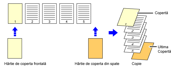 ![]() Inserează o copertă din faţă la începutul copiilor şi realizează o copie pe o singură faţă pe a şasea pagină a originalului pentru coperta din spate. |