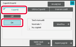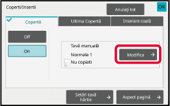 Atunci când inseraţi o copertă din spate, atingeţi scurt fila [Ultima Copertă] şi apoi tasta [On].Atingeți tasta [Modifica].