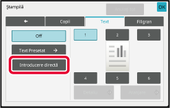 Formatul filei [Text] poate fi introdus utilizând textul presetat sau tastatura virtuală.Atingeţi scurt tasta corespunzătoare poziţiei dorite.