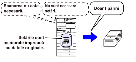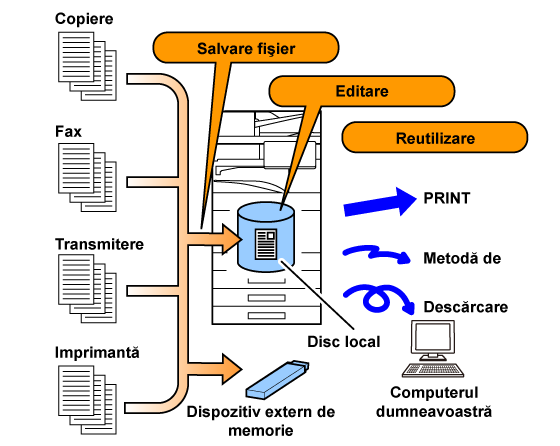 În timpul copierii, al trimiterii unei imagini sau al oricărei alte operații, această funcție salvează pe hard disk datele documentului. Utilizaţi această funcţie când doriţi să salvaţi rapid şi uşor datele documentului, fără să specificaţi un nume de fişier sau alte informaţii. Fişierul salvat poate fi utilizat de asemenea de alte persoane. Nu utilizaţi această metodă pentru a salva fişiere care nu doriţi să fie utilizate de alte persoane. |