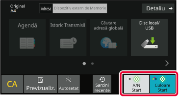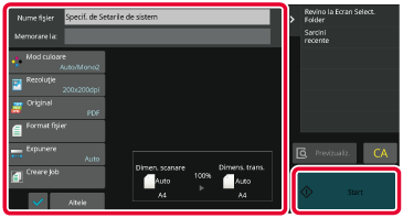 Puneţi originalul în tava de alimentare cu documente a alimentatorului automat de documente sau pe geamul pentru documente.Verificați numele fişierului şi locul de salvare şi atingeți tastele pentru orice setare pe care doriți să o selectați.