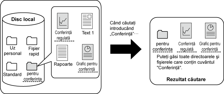 • Puteţi de asemenea utiliza funcţia de căutare fişiere în modul setare (versiune Web). Apăsați pe [Operatii document] în "Setări (versiune web)" → [Memorare documente] → [Căutare].