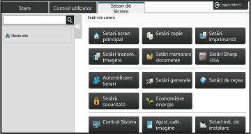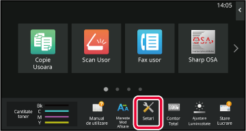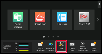 "Setări" permite gestionarea diferitelor funcții pentru a asigura manevrarea confortabilă a echipamentului, precum înregistrarea implicită pentru fiecare funcție, setări conectare rețea, verificarea jurnalului de stări ale activităților.