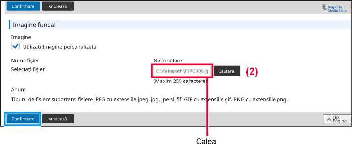 Selectați "Utilizati Imagine personalizata" şi faceți clic pe butonul [Cautare] pentru a selecta imaginea dorită.