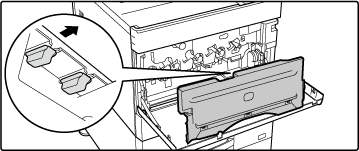 Откройте, нажимая на выпуклые части по обеим сторонам.Выньте контейнер отработанного тонера.