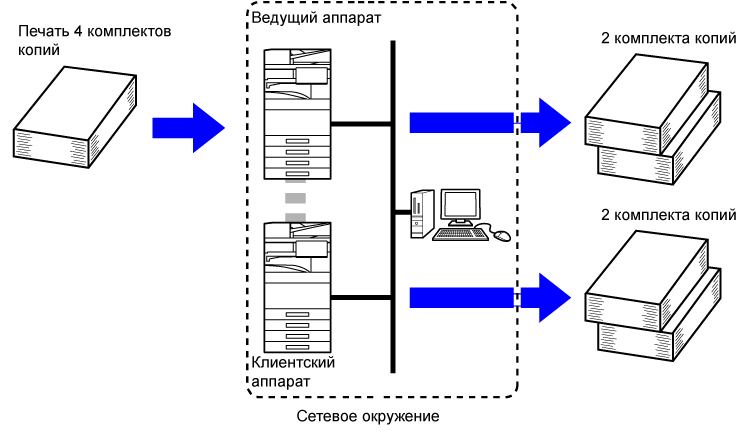 Можно установить до 9999 копий (комплектов). Указанное число копий будет распределено между первичным и вторичным устройствами. Если будет введено нечетное число копий, первичное устройство сделает больше копий, чем вторичное устройство.Коснитесь кнопки [Цвет Старт] или [Ч/Б Старт], чтобы начать копирование.