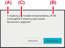 На экране подтверждения указано число сканированных листов оригинала (A), число сканированных сторон (B) и число копий, за исключением пустых страниц (C).Вы можете отрегулировать фон, сделав светлые