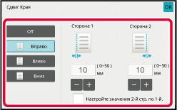 Коснитесь кнопки дисплея с числовым значением области смещения полей на лицевой или обратной стороне, затем введите область с помощью цифровых кнопок.Коснитесь кнопки [Цвет Старт] или [Ч/Б Старт], чтобы начать копирование.