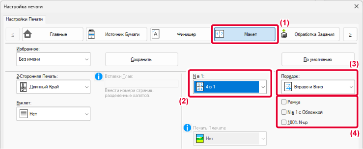 на лист) или [4 в 1] (4 странцы на лист), в зависимости от